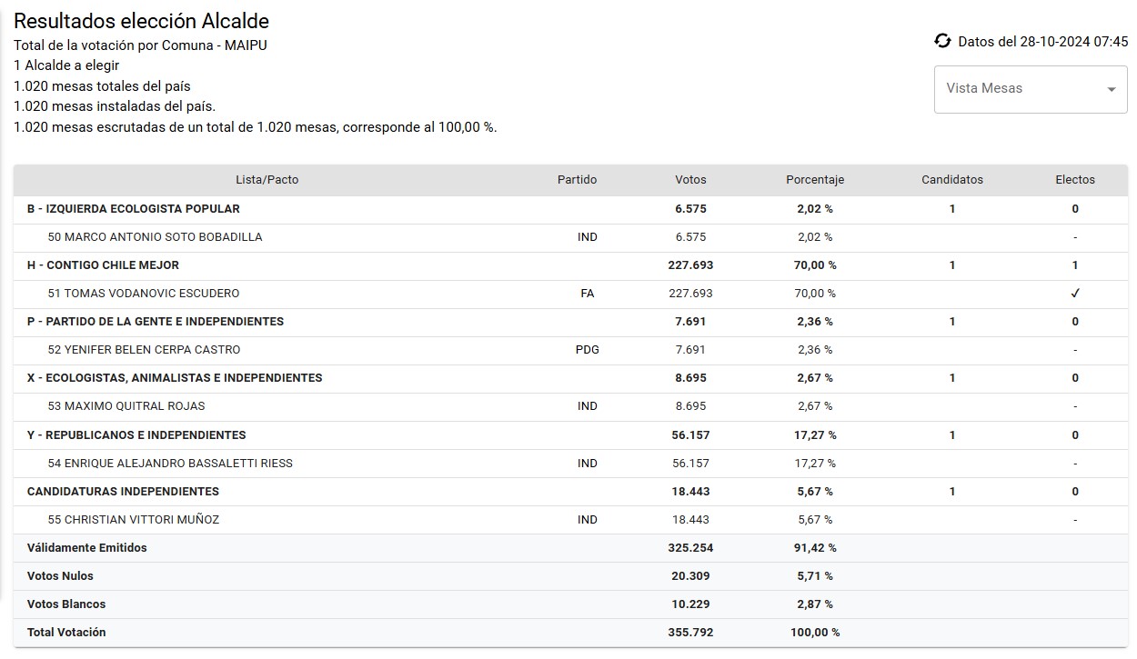 En un resultado que marca un importante alivio para el Frente Amplio, Tomás Vodanovic ha sido reelecto como alcalde de Maipú en las elecciones municipales de octubre de 2024.