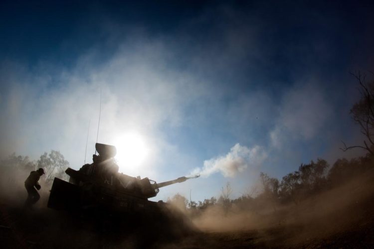 [Imagen: Fuerzas de artillería de las Fuerzas de Defensa de Israel disparando en la Franja de Gaza el 16 de julio como parte de la Operación Margen Protector. | (CC) Israel Defense Forces].