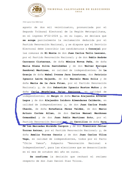 Parte del fallo del TRICEL, que acepta las candidaturas de RN en Maipú:
