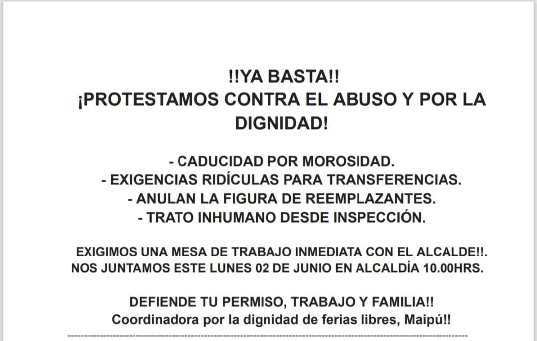 Este lunes 2 de mayo, cerca de las 10 am. un centenar de feriantes organizados marcharon por los patios interiores de la Municipalidad de Maipú, ubicada en Avenida 5 de abril, en pleno centro de Maipú. Al grito de “¡La feria unida jamás será vencida!”, denuncian una seguidilla de medidas que —afirman— atentan contra su derecho a trabajar dignamente.