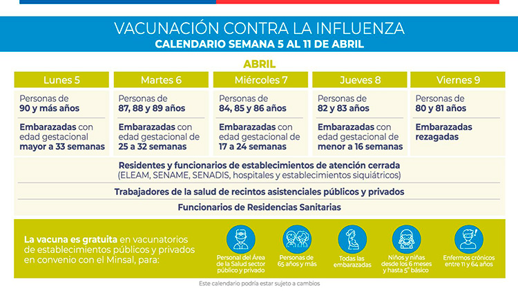 Cada año, tanto niños como embarazadas, adultos y adultos mayores son vacunados contra la influenza, de manera gratuita por el Ministerio de Salud, el cual ya publicó el calendario para la población objetivo a vacunar, a contar del lunes 5 de abril y hasta el 6 de junio de este año.
