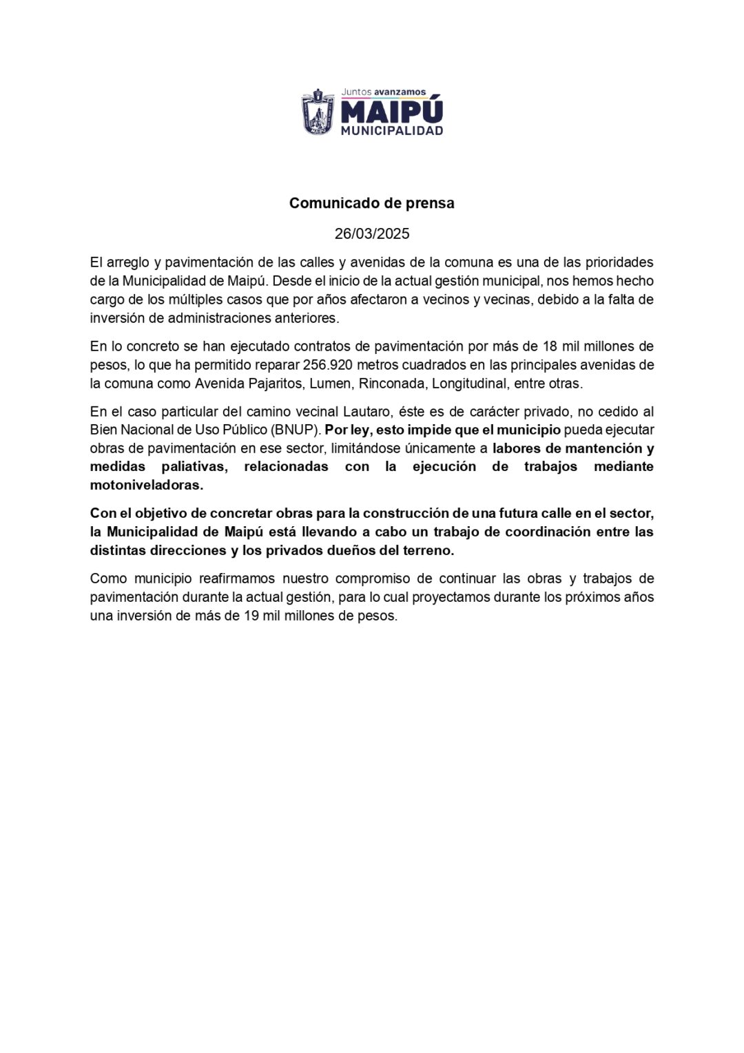 Desde la municipalidad de Maipú explicaron en un comunicado que el Camino Lautaro es una vía de carácter privado y no ha sido cedido al Bien Nacional de Uso Público, lo que impide la ejecución de obras de pavimentación.